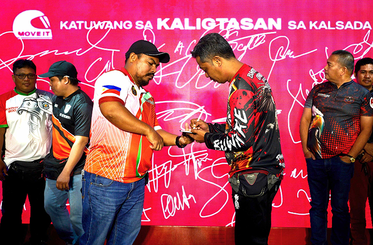 Leaders of MOVE IT rider-partner communities sign the Katuwang sa Kaligtasan sa Kalsada pledge as they co-champion a safety-first culture in the motorcycle-taxi industry. Spearheading the pledge is Motorcycle Community Philippines Chairman Romeo Maglunsod.